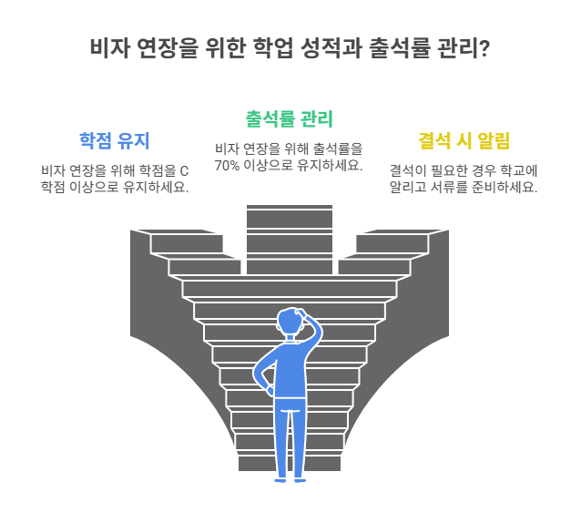 학점: 직전 학기 성적이 C학점 (평균 2.0) 이상을 유지해야 합니다. 성적 미달 시 비자 연장이 불허될 수 있으므로, 학점 관리에 신경 써야 합니다.